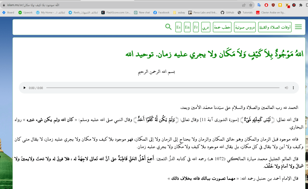 اللهُ مَوْجُودٌ بِلاَ كَيْفٍ وَلاَ مَكَان ولا يجري عليه زمان. توحيد الله