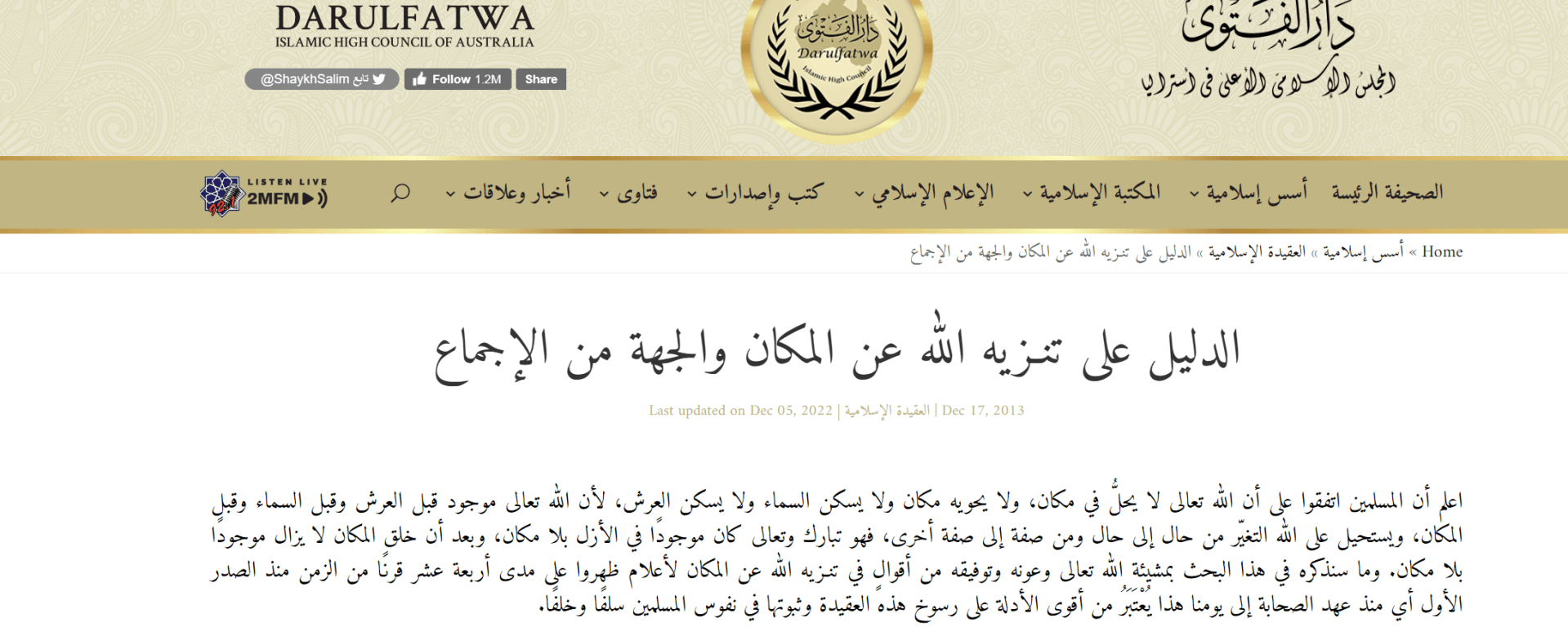 اعلم أن المسلمين اتفقوا على أن الله تعالى لا يحلُّ في مكان، ولا يحويه مكان ولا يسكن السماء ولا يسكن العرش، لأن الله تعالى موجود قبل العرش وقبل السماء وقبل المكان، ويستحيل على الله التغيّر من حال إلى حال ومن صفة إلى صفة أخرى، فهو تبارك وتعالى كان موجودًا في الأزل بلا مكان، وبعد أن خلق المكان لا يزال موجودًا بلا مكان. وما سنذكره في هذا البحث بمشيئة الله تعالى وعونه وتوفيقه من أقوالٍ في تنـزيه الله عن المكان لأعلام ظهروا على مدى أربعة عشر قرنًا من الزمن منذ الصدر الأول أي منذ عهد الصحابة إلى يومنا هذا يُعْتَبَرُ من أقوى الأدلة على رسوخ هذه العقيدة وثبوتها في نفوس المسلمين سلفًا وخلفًا.