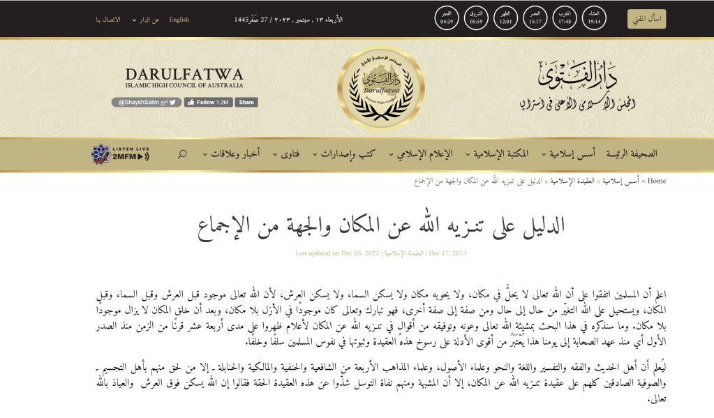 الدليل على تنـزيه الله عن المكان والجهة من الإجماع