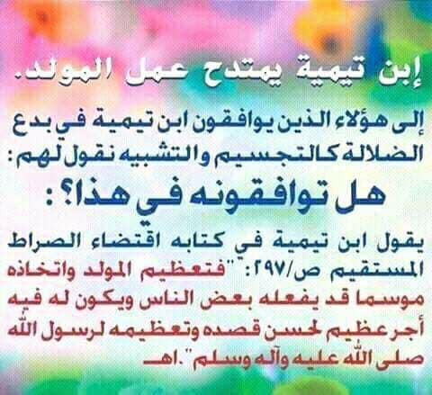 ومع ذلك فإن رؤوس هذه الطائفة الوهابيَّة المُعتبرين عِـندهم أمثال ( ابن تيمية الحرَّاني ) استحسن عمل المولدُ الشّريف في كِتابه اقتضاء الصراط المُستقيم في مخالفة أصحاب الجحيم ، حيث قال فيهِ ما نَصهُ :
