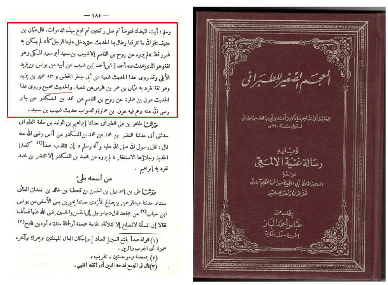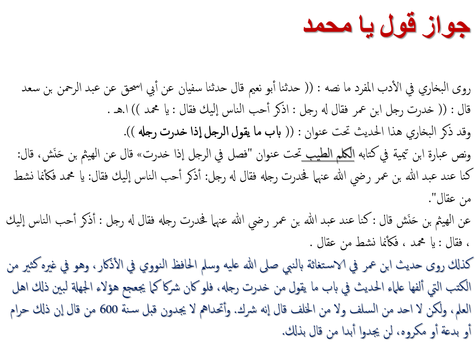 كذلك روى حديث ابن عمر في الاستغاثة بالنبي صلى الله عليه وسلم الحافظ النووي في الأذكار، وهو في غيره كثير من الكتب التي ألفها علماء الحديث في باب ما يقول من خدرت رجله، فلو كان شركا كما يجعجع هؤلاء الجهلة لبين ذلك اهل العلم، ولكن لا احد من السلف ولا من الخلف قال إنه شرك. وأتحداهم لا يجدون قبل سنة 600 من قال إن ذلك حرام أو بدعة أو مكروه، لن يجدوا أبدا من قال بذلك.