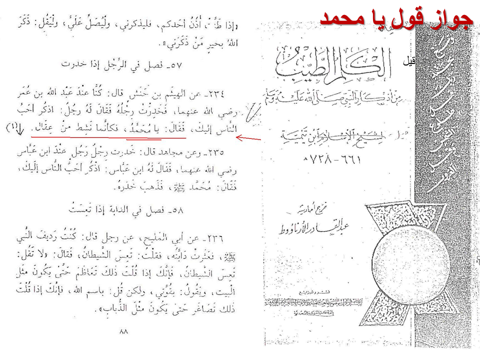 ونص عبارة ابن تيمية في كتابه الكلم الطيب تحت عنوان “فصل في الرجل إذا خدرت» قال عن الهيثم بن حَنَش، قال: كنا عند عبد الله بن عمر رضي الله عنهما فخدرت رجله فقال له رجل: أذكر أحب الناس إليك فقال: يا محمد فكأنما نشط من عقال”.عن الهيثم بن حَنَش قال : كنا عند عبد الله بن عمر رضي الله عنهما فخدرت رجله فقال له رجل : أذكر أحب الناس إليك ، فقال : يا محمد ، فكأنما نشط من عقال .