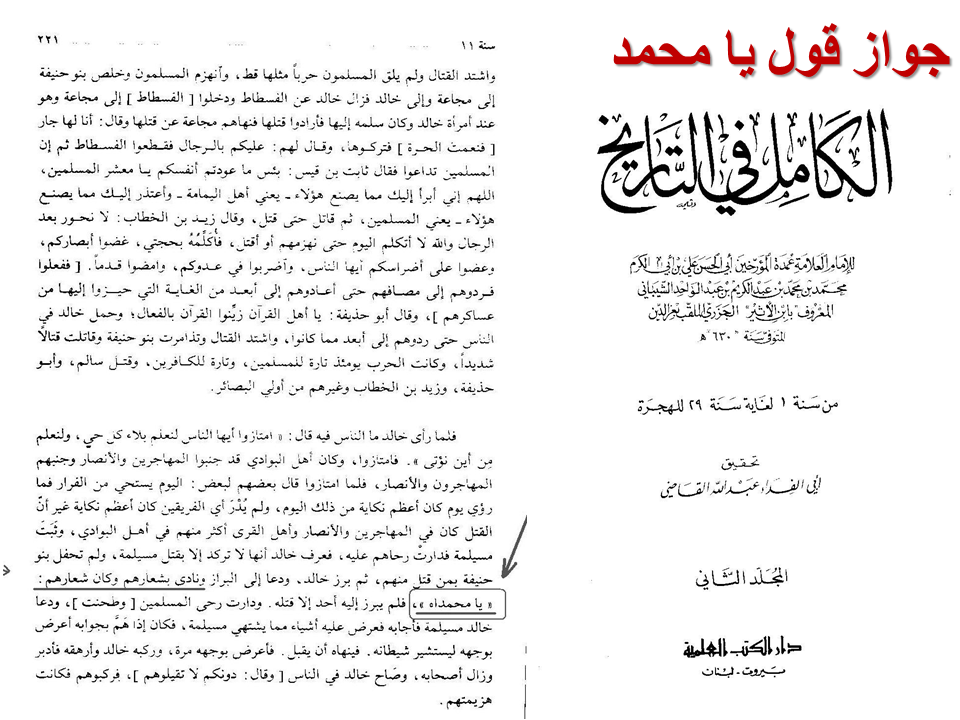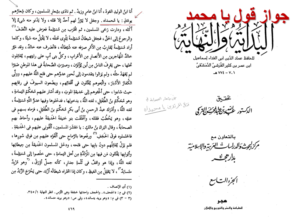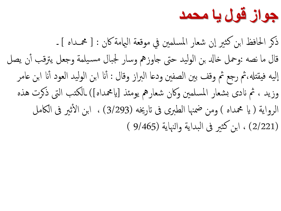 قال ما نصه :وحمل خالد بن الوليد حتى جاوزهم وسار لجبال مسيلمة وجعل يترقب أن يصل إليه فيقتله،ثم رجع ثم وقف بين الصفين ودعا البراز وقال : أنا ابن الوليد العود أنا ابن عامر وزيد ، ثم نادى بشعار المسلمين وكان شعارهم يومئذ [يامحمداه]) ـالكتب التى ذكرت هذه الرواية ( يا محمداه ) ومن ضمنها الطبرى فى تاريخه (3/293) ، ابن الأثير فى الكامل (2/221) ، ابن كثير فى البداية والنهاية (9/465 )