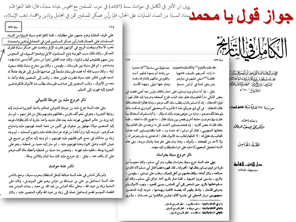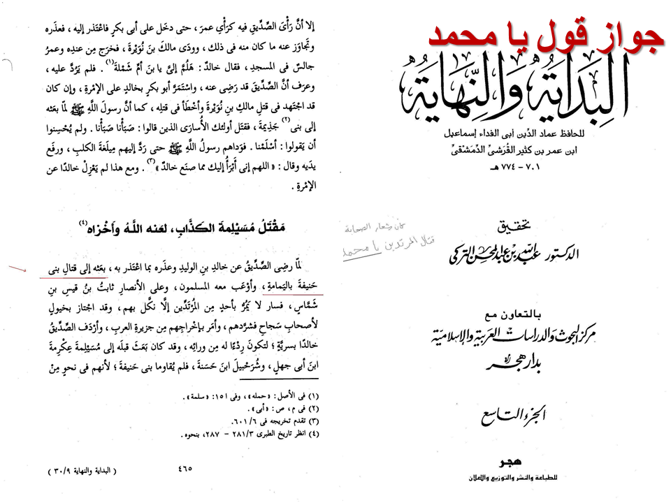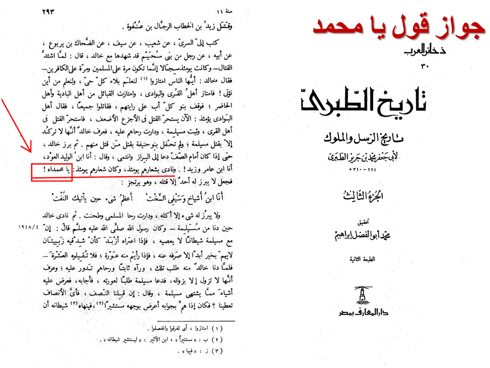 ذكر الإمام الطبري رضي الله عنه في تاريخه وكان من علماء السلف وأئمتهم ومجتهديهم توفي سنة 310 هـ في حوادث حروب الردة بعد وفاة رسول الله صلى الله عليه وسلم أيام أبي بكر الصديق أن خالد بن الوليد رضي الله عنه نادى بشعار الصحابة رضي الله عنهم يومئذ في حرب اليمامة مع مسيلمة الكذاب، وكان شعارهم يومئذ “يا محمداه” فجعل لا يبرز له أحد إلا قتله، اهـ. فلينظر العاقل إلى استغاثة واستنصار الصحابة برسول الله صلى الله عليه وسلم في حروبهم في نجد ضد مسيلمة الكذاب، فهل من عاقل يعرف الله تعالى ورسوله صلى الله عليه وسلم يحرّم ما استحسنه الصحابة رضوان الله عليهم من الرعيل الأول أيام أبي بكر وعمر ولأمثال خالد بن الوليد سيف الله ورسوله، فليتعجب المؤمن من جهالة الوهابية النجدية يحرّمون ما أحل الله ويكفرون أصحاب رسول الله صلى الله عليه وسلم، إنه لأمر عجيب حقاً، الله ينجينا. والله خالق كل شئ إنما هي أسباب مخلوقة