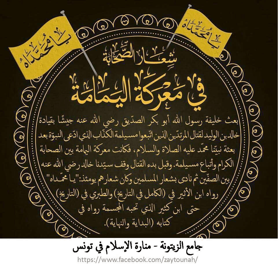 ذكر الحافظ ابن كثير إن شعار المسلمين في موقعة اليمامة كان : [ محمـــداه ] ـ