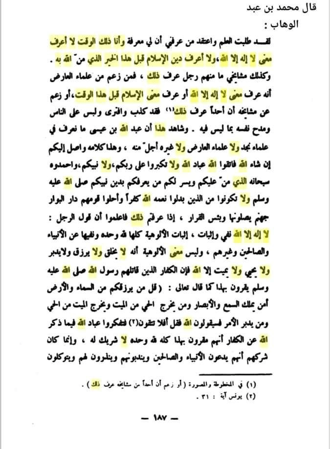 فيقول : «وأنا ذلك الوقت لا أعرف معنى “لا إله إلا الله” ولا أعرف دين الإسلام، قبل هذا الخير الذي مَنَّ الله به، وكذلك مشايخي ما منهم رجل عرف ذلك، فمن زعم من علماء العارض أنه عرف معنى “لا إله إلا الله” أو عرف معنى الإسلام قبل هذا الوقت، أو زعم عن مشايخه أن أحداً عرف ذلك، فقد كذب وافترى ولبّس على الناس ومدح نفسه بما ليس فيه» اهـ.