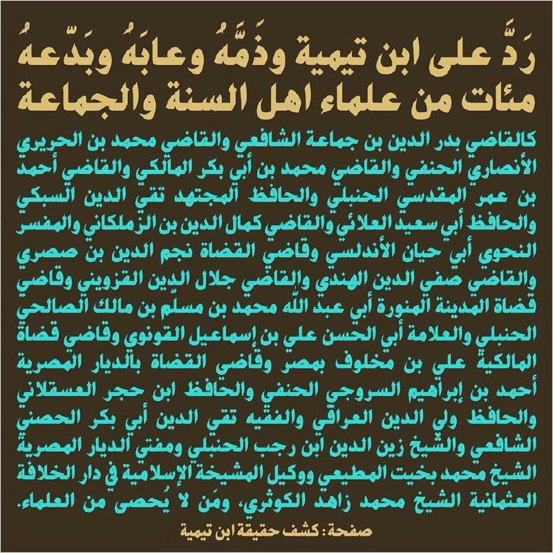 مئات من علماء اهل السنة والجماعة ممن ردوا على ابن تيمية وذمّوه وعابوه وبدّعوه