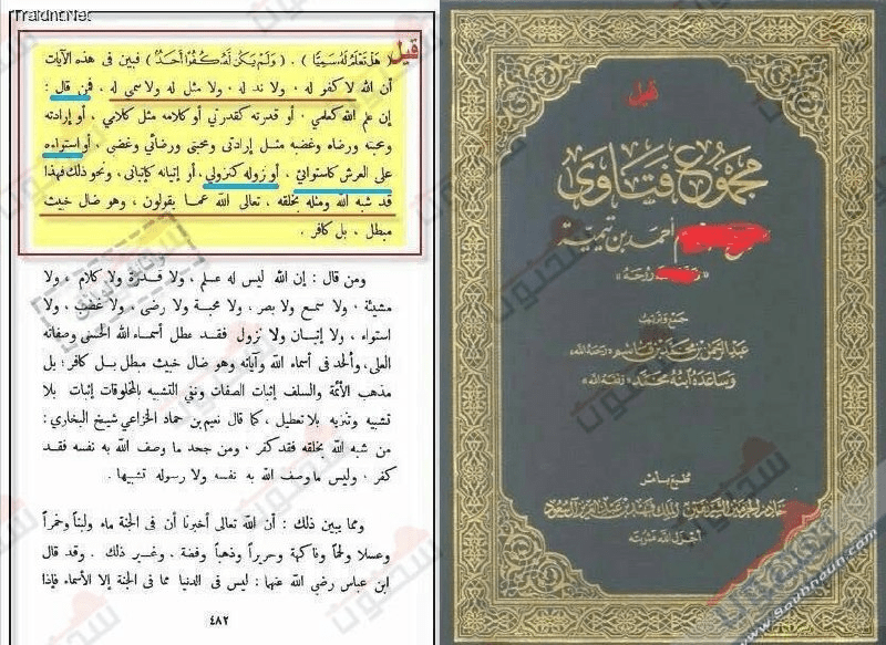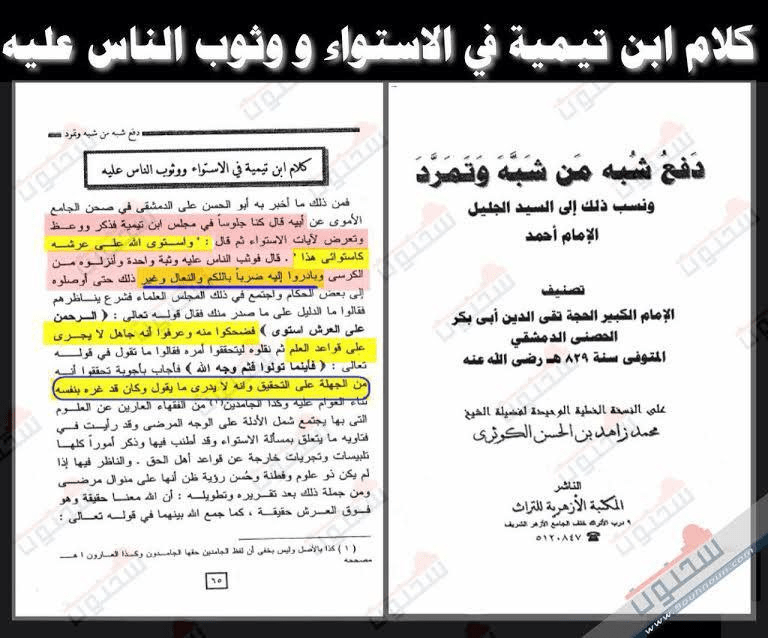 ابن تيمية نفسه شيخ المجسمة في كتابه المسمى مجموع الفتاوى يقول (فمن قال أن استواءه (عن الله) على العرش كاستوائي أو نزوله كنزولي فقد شبه الله ومثله بخلقه، تعالى الله عما يقولون، وهو ضال خبيث بل كافر).
