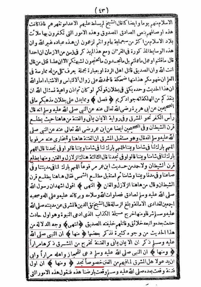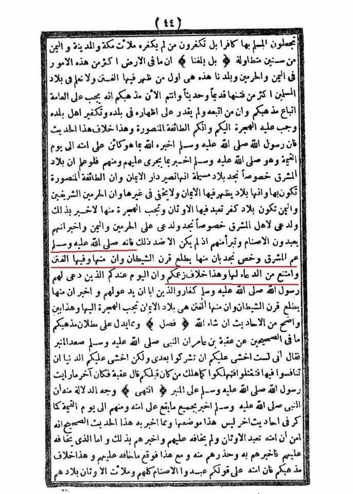 عاصَرَ محمدَّ بن عبد الوهّاب الضالَّ أخوهُ الشيخ الصالِحُ سُلَيمانُ بنُ عبدِ الوَهّاب ورَدَّ عليه في كِتابِه الشهير “الصَواعِقُ الإلهية في الرَدّ علَى الوَهّابيّة”. وقَد فَسَّر الشيخ سُلَيمانُ الحديثَ المذكُور بأنّ نجدَ الحِجاز هي مكان الفِتن والزَلازِل حيث يَطلُع قَرْنُ الشيطان.