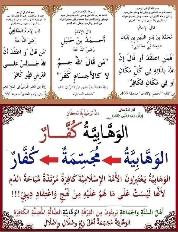 *فما أوقحهم الوهابية وما أغباهم واكفرهم وهل أهل المذاهب الأربعة إلا جمهور هذه الأمة التي مدحها الله تعالى بقوله :{كنتم خيرَ أمة} [سورة ءال عمران/110]*
