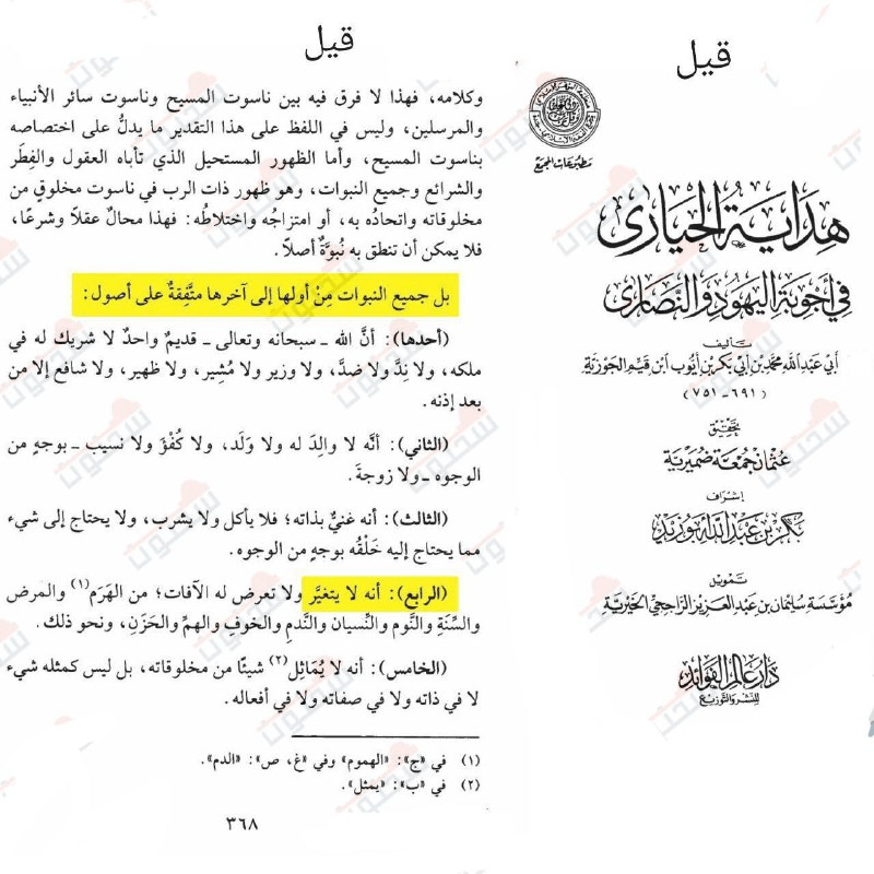 ففي كتابه المسمى (هداية الحيارى)، يقول ابن القيم: (بل النبوات من أولها إلى ءاخرها متفقة على أصول…)