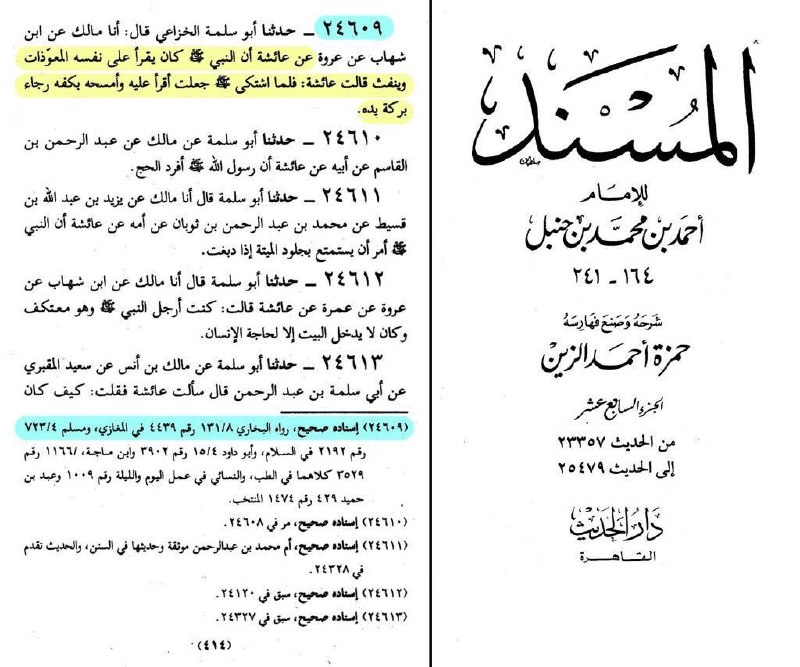 والإمام أحمد بن حَنبل في مسنده ينقل عن السيدة عائشة أنها ترجو بركة يد النبي صلى الله عليه وسلم..