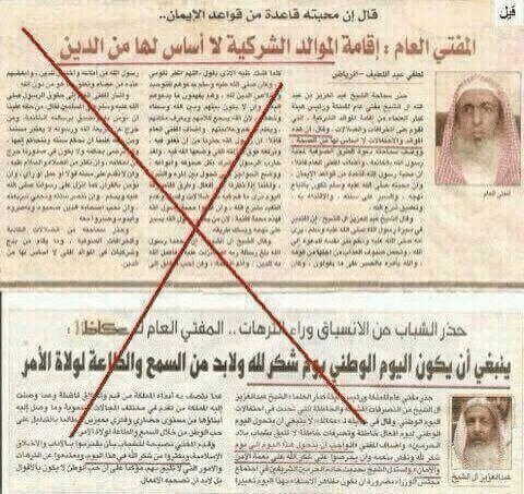 مفتي الوهابية ءال الشيخ يقول عن إقامة المولد شرك ولا أساس له من الدين وأما اليوم الوطني فهو بزعم الوهابي ءال الشيخ يوم شكر لله
