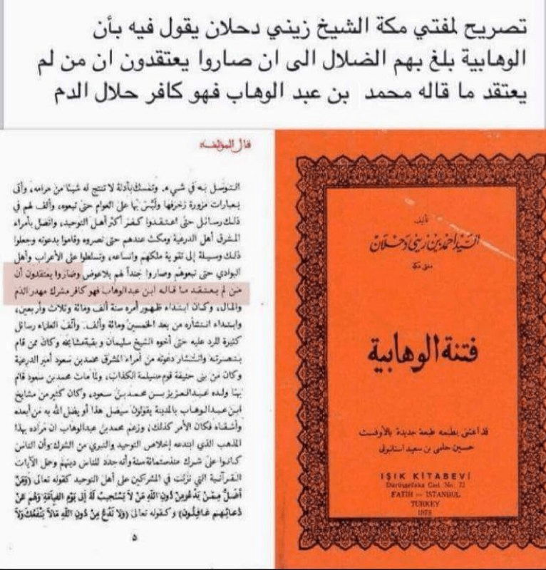 في كتاب “فتنة الوهابية” لمفتي الشافعية في بلاد الحجاز الشيخ زيني دحلان المتوفى سنة 1886، وكتاب “أمراء البلد الحرام” حيث حكى الشيخ زيني دحلان رحمه الله كيف دخلوا مدينة الطائف قرب مكة المكرمة وأفنوا من فيها وسرقوها ونهبوها لاستحلالهم دماء مخالفيهم وأموالهم لأنهم يعتبرونهم مشركين والعياذ بالله،*