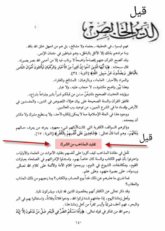 الوهابية يقولون:”تقليد المذاهب من الشرك”، في كتابهم المسمى “الدين الخالص” ص/140، فهذا تصريح منهم بتكفير الشافعية والحنفية والمالكية والحنابلة وسائر أهل المذاهب المعتبرة *