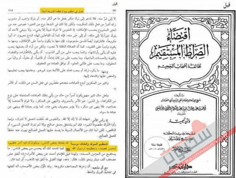 ففي كتابه المسمى اقتضاء الصراط المستقيم ابن تيمية يقول: ” فتعظيم المولد واتخاذه موسما فيه أجر عظيم لحسن قصده ولتعظيمه لرسول الله صلى الله عليه وسلم “