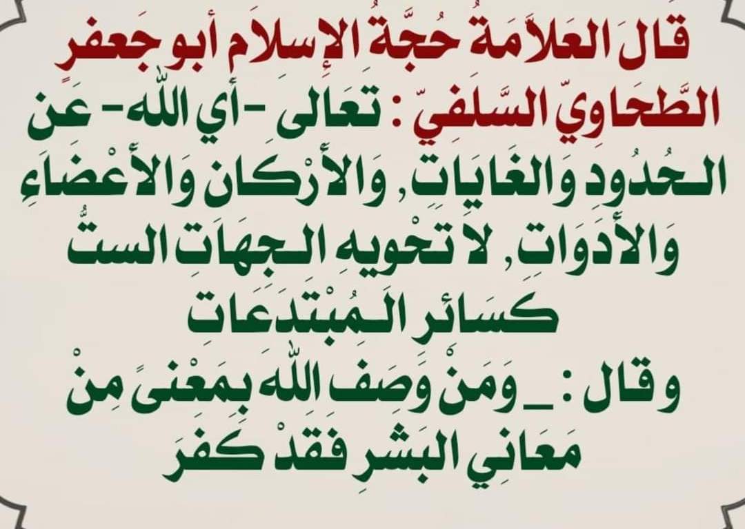 واعلم يا طالب الحق والهدى أنه لو لم يكن دليل على كفر المشبهة المجسمة الذين يصفون الله بالمكان أو الجهة أو الجلوس أو الاستقرار على العرش أو فوقه والقائلين بالحركة أو السكون فى حق الله تعالى إلا قوله تعالى:ليس كمثله شئ ، لكفى