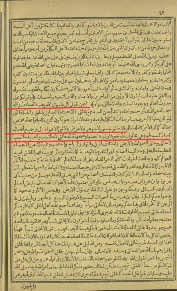 ومما جاء في هذا الكتاب قوله: “فهو تعالى لا تحله الحوادث ولا يحل في حادث ولا ينحصر فيه فمن اعتقد او قال أن الله بذاته في كل مكان او في مكان فكافر، بل يجب الجزم بأنه تعالى بائن من خلقه مستو على عرشه من غير تكييف ولا تشبيه ولا تمثيل، فالله تعالى كان ولا مكان، ثم خلق المكان وهو تعالى كما كان قبل خلق المكان”. انتهى