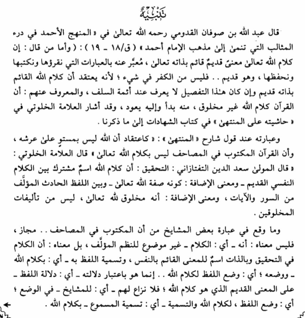 ولينظر أيضا لتناقض العبارة المنسوبة لأبي الفضل التميمي، حيث زعموا أنه قال: “وكان -أي الإمام أحمد- يقول إن القرآن كيف تصرف غير مخلوق وأن الله تعالى تكلم بالصوت والحرف”. انتهى