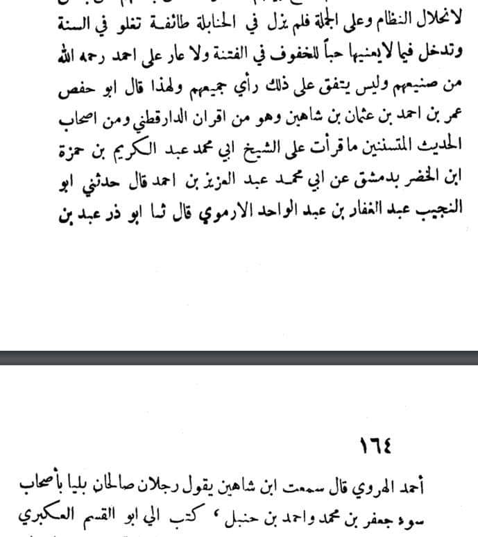 كما ورد في ذيل طبقات الحنابلة أيضا أن أبا الفضل قال ما نصه: “كان الإمام أحمد رحمه الله يقول: إن لله تعالى يدين، وهما صفة له في ذاته، ليستا بجارحتين، وليستا بمركبتين، ولا جسم ولا من جنس الأجسام، ولا من جنس المحدود والتركيب والأبعاض والجوارح، ولا يقاس على ذلك، ولا له مرفق، ولا عضد، ولا فيما يقتضى ذلك من إطلاق قولهم: “يد” إلا ما نطق القرآن الكريم به، أو صحَّت عن رسول الله صلى الله تعالى عليه وآله وسلم السنة فيه” انتهى