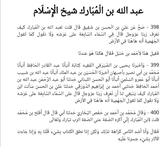ب-قال الذهبي في العلو للعلي الغفار: “صح عن علي بن الحسن بن شقيق قال: قلت لعبد الله بن المبارك كيف نعرف ربنا عزوجل، قال: في السماء السابعة على عرشه ولا نقول كما تقول الجهمية: أنه هاهنا في الأرض. فقيل هذا لأحمد بن حنبل فقال: هكذا هو عندنا”. انتهى