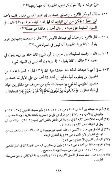 وقال: “قال ابو بكر الأثرم، وحدثني محمد بن ابراهيم القيسي، قال: قلت لأحمد ابن حنبل يحكى عن ابن المبارك انه قيل له كيف نعرف ربنا قال في السماء السابعة على عرشه قال احمد: هكذا هو عندنا”. انتهى