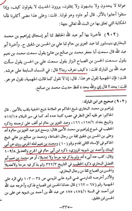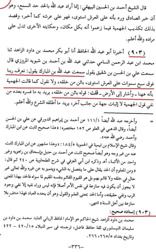 ب- البيهقي في الأسماء والصفات، باب قول الله عز وجل لعيسى عليه السلام : إني متوفيك، قال : “فأخبرنا بها أبو عبد الله الحافظ ، ثنا أبو إسحاق إبراهيم بن محمد البخاري بنيسابور ، ثنا عبد العزيز بن حاتم ، ثنا علي بن الحسن بن شقيق ، ح . وأخبرنا أبو عبد الله ، قال : سمعت أبا جعفر محمد بن صالح بن هانئ ، يقول : سمعت محمد بن نعيم ، يقول : سمعت الحسن بن الصباح البزاز ، يقول : سمعت علي بن الحسن ، يقول : سألت عبد الله بن المبارك قلت : كيف نعرف ربنا ؟ قال : في السماء السابعة على عرشه . قلت : فإن الجهمية تقول : هو هذا . قال : إنا لا نقول كما قالت الجهمية ، نقول : هو هو . قلت : بحد ؟ قال : إي والله بحد . لفظ حديث محمد بن صالح” . انتهى