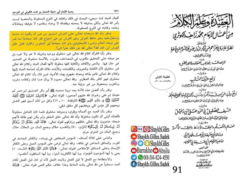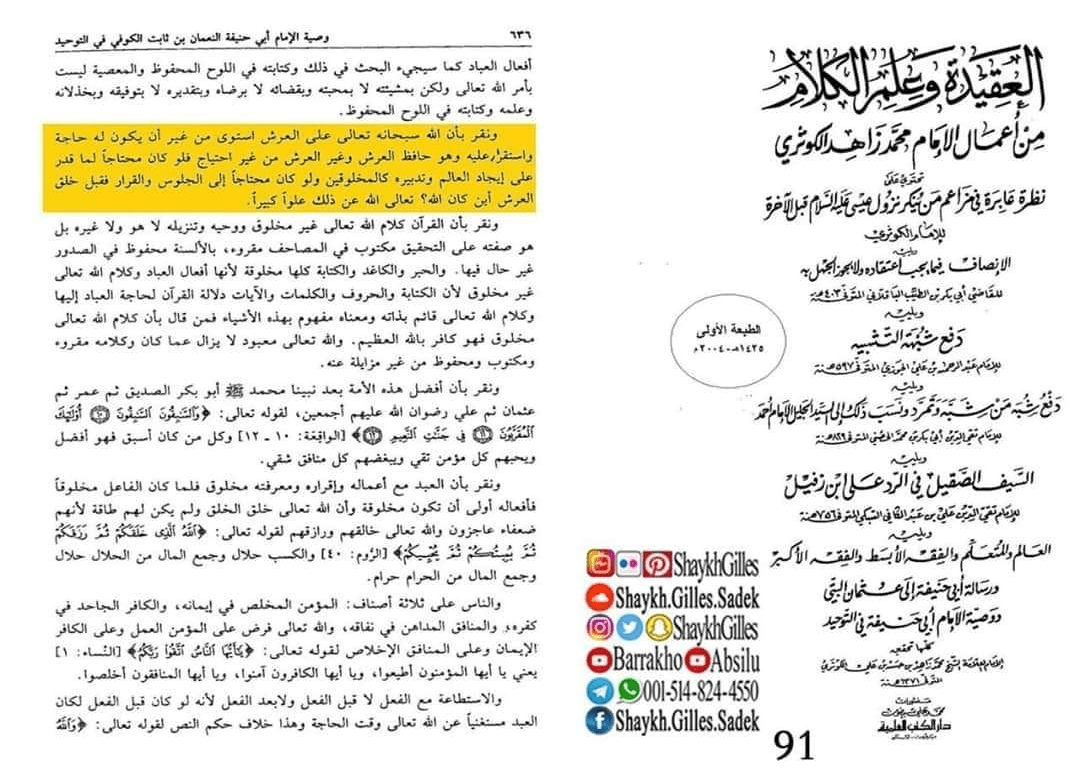 ونُقِرّ بأنّ الله سبحانه وتعالى على العرش استوى من غير أن يكون له حاجة واستقرار عليه وهو حافظ العرش وغير العرش من غير
