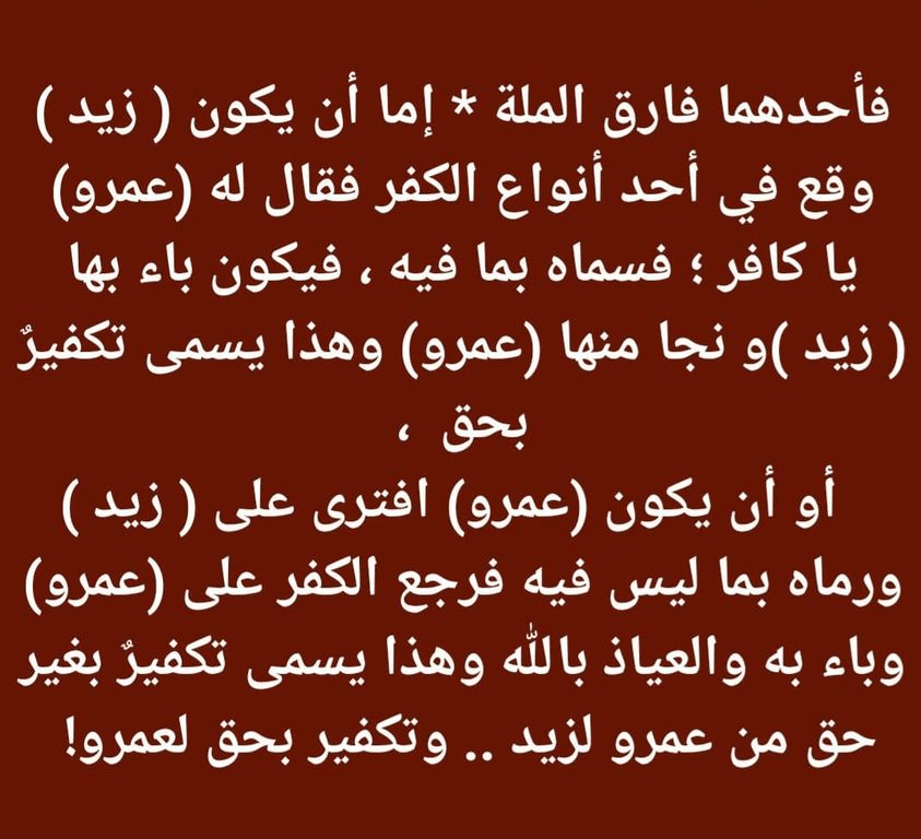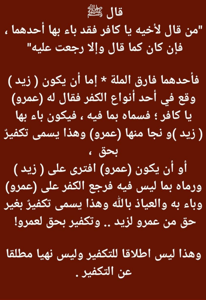 قول النبي صلى الله عليه وسلم: ((مَن قال لأخيه يا كافر فقد باء بها أحدهما)) – وفي راوية: ((فإن كان كما قال، وإلا حارت عليه))؛ (رواه البخاري ومسلم).