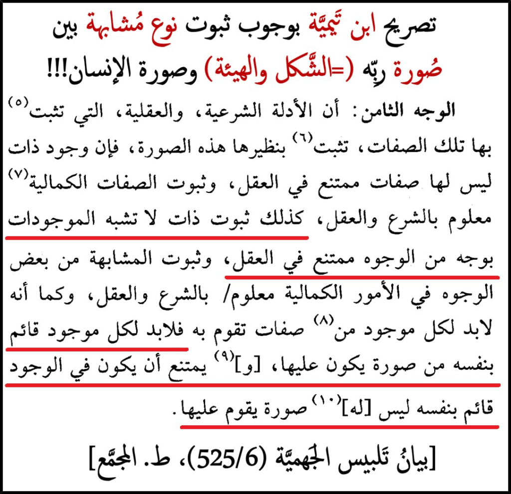 تصريح ابن تَيميَّة بوجوب ثبوت نوع مُشابهة بين صُورة ربِّه (=الشَّكل والهيئة) وصورة الإنسان!!! [بيانُ تَلبيس الجَهميَّة (6/525)، ط. المجمَّع]
