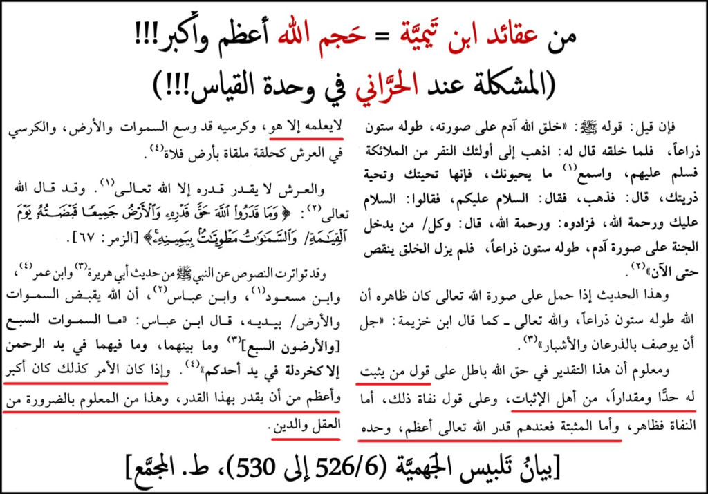 من عقائد ابن تَيميَّة = حَجم الله أعظم وأكبر!!! (المشكلة عند الحرَّاني في وحدة القياس!!!) [بيانُ تَلبيس الجَهميَّة (6/526 إلى 530)، ط. المجمَّع].