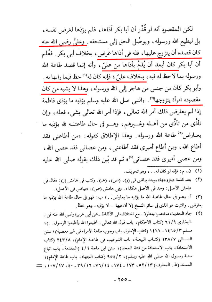 ( لو قدر أن أبابكر آذاها فلم يؤذها لغرض في نفسه بل ليطيع الله ورسوله … ( وعلي رضي الله عنه كان قصده أن يتزوج عليها فله في أذاها غرض بخلاف أبي بكر فعلم أن أبا بكر كان أبعد أن يذم بأذاها من علي وأنه إنما قصد طاعة الله ورسوله بما لا حظ له فيه بخلاف علي )