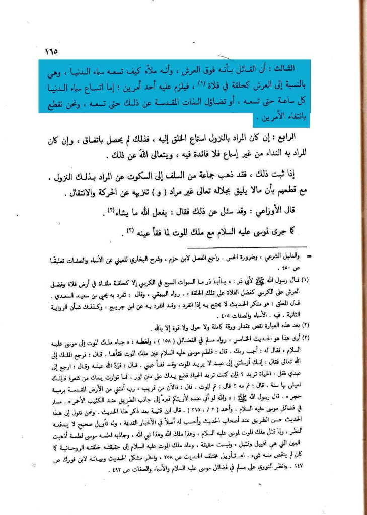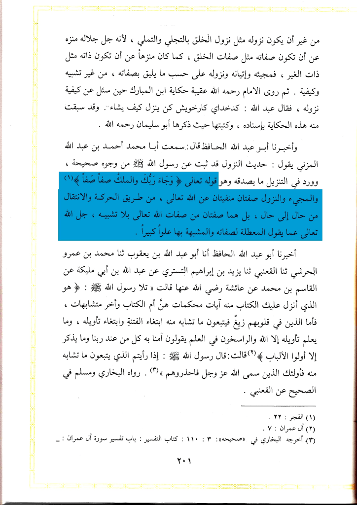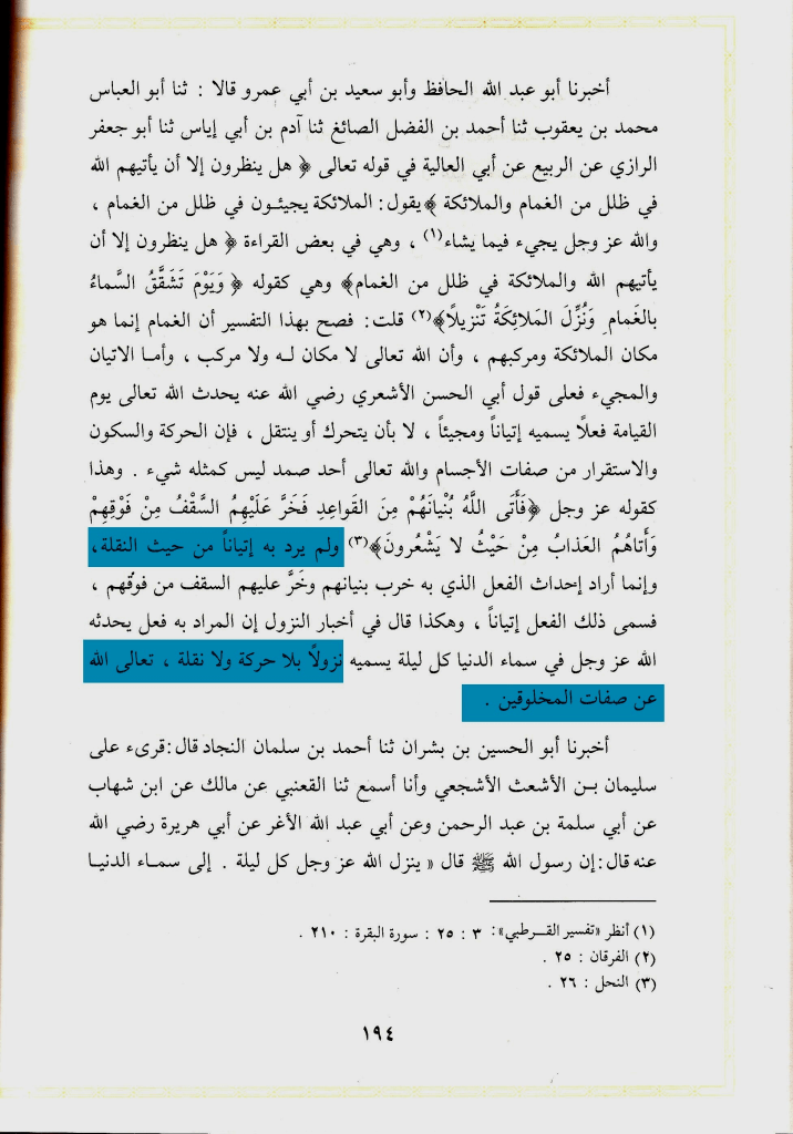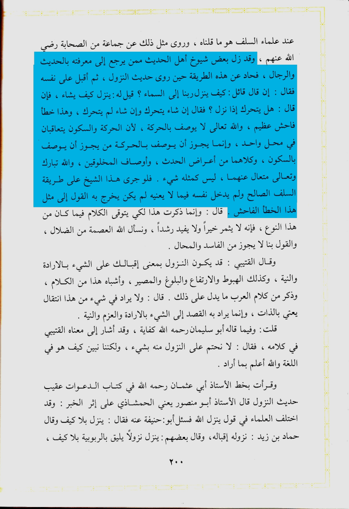 وقال في كتابه شرح حديث النزول ايضًا: » وحينئذ فإذا قال السلف والأئمة كحماد بن زيد وإسحاق بن راهويه وغيرهما من أئمة أهل السنة إنه ينزل ولا يخلو منه العرش لم يجز أن يقال: إن ذلك ممتنع » اهـ. ثم قال ما نصه : وأصل هذا أن قربه سبحانه ودنوه من بعض مخلوقاته لا يستلزم أن تخلو ذاته من فوق العرش بل هو فوق العرش ويقرب من خلقه كيف شاء, كما قال ذلك من قاله من السلف » اهـ