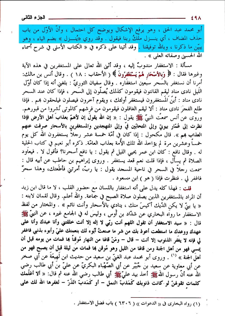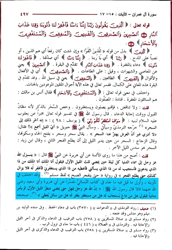 قال القرطبي في تفسير سورة ءال عمران عند قوله تعالى: « وَالْمُسْتَغْفِرِينَ بِالأَسْحَارِ » بعد ذكره حديث النزول وما قيل فيه ما نصه : « وأولى ما قيل فيه ما جاء في كتاب النسائي مفسرا عن أبي هريرة وأبي سعيد رضي الله عنهما قالا: قال رسول الله: ((إن الله عز وجل يمهل حتى يمضي شطر الليل الأول ثم يأمر مناديا فيقول هل من داع يستجاب له؟، هل من مستغفر يغفر له، هل من سائل يعطى))، صححه أبو محمد عبد الحق، وهو يرفع الإشكال ويوضح كل احتمال، وأن الأول من باب حذف المضاف، أي ينزل ملك ربنا فيقول، وقد روى ((يُنزل)) بضم الياء وهو يبين ما ذكرنا » اه