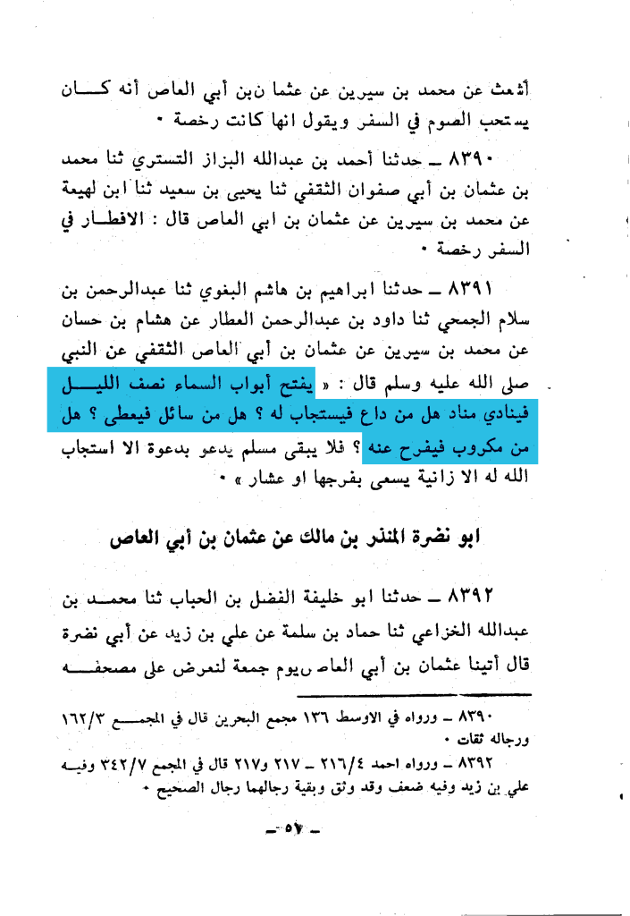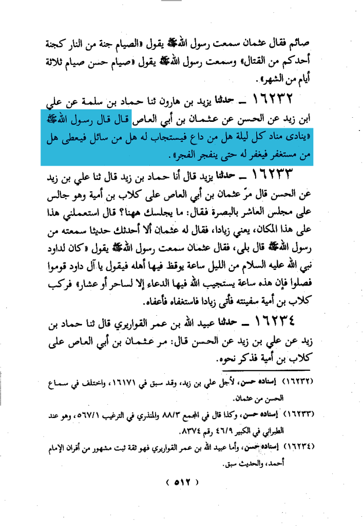 قلت: وحديث عثمان بن أبي الغاص أخرجه أحمد في مسنده بلفظ: ((ينادي مناد كل ليلة: هل من داع فيستجاب له، هل من سائل فيعطى، هل من مستغفر فيغفر له، حتى ينفجر الفجر))،
