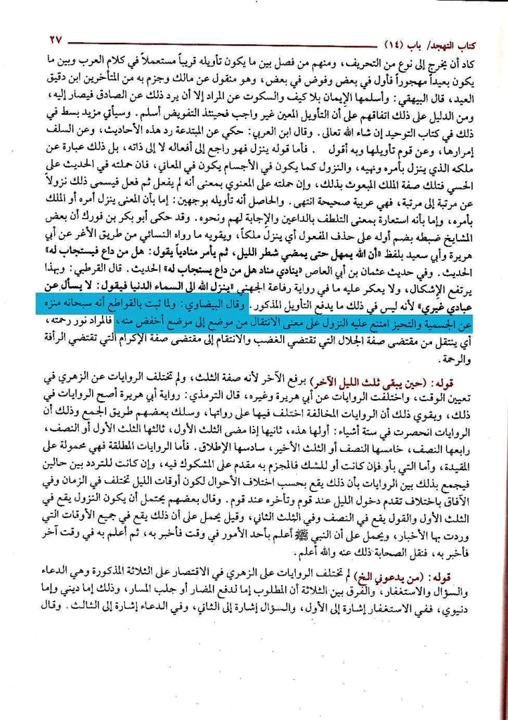 ونقل الحافظ ابن حجر في فتح الباري قول البيضاوي ونصه : ((وقال البيضاوي: ولما ثبت بالقواطع أنه سبحانه منزه عن الجسمية والتحيز امتنع عليه النزول على معنى الانتقال من موضع إلى موضع أخفض منه )) اهـ