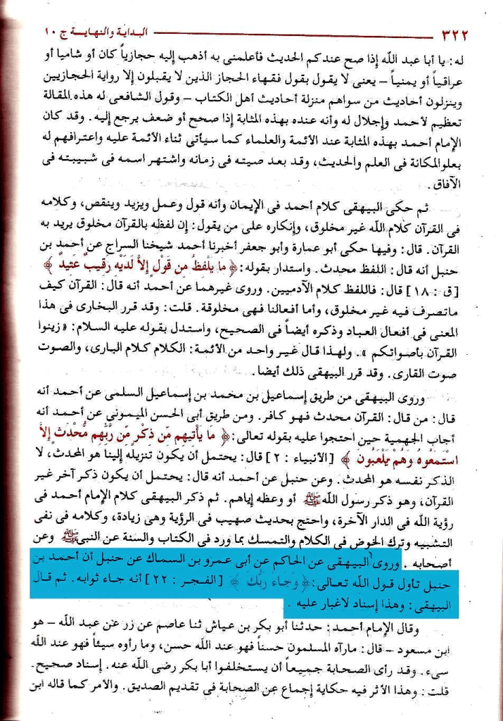 وقال البيهقي في مناقب أحمد : « أنبأنا الحاكم قال حدثنا أبو عمرو ابن السماك قال: حدثنا حنبل بن إسحق قال: سمعت عمي أبا عبد الله يعني أحمد يقول: احتجوا علي يومئذ، يعني يوم نوظر في دار أمير المؤمنين. فقالوا تجيء سورة البقرة يوم القيامة وتجيء سورة تبارك فقلت لهم: إنما هو الثواب، قال الله تعالى: « وَجَاء رَبُّكَ » [سورة الفجر] إنما يأتي قدرته، وإنما القرءان أمثال ومواعظ. نقله عنه ابن كثير في كتابه البداية و النهاية