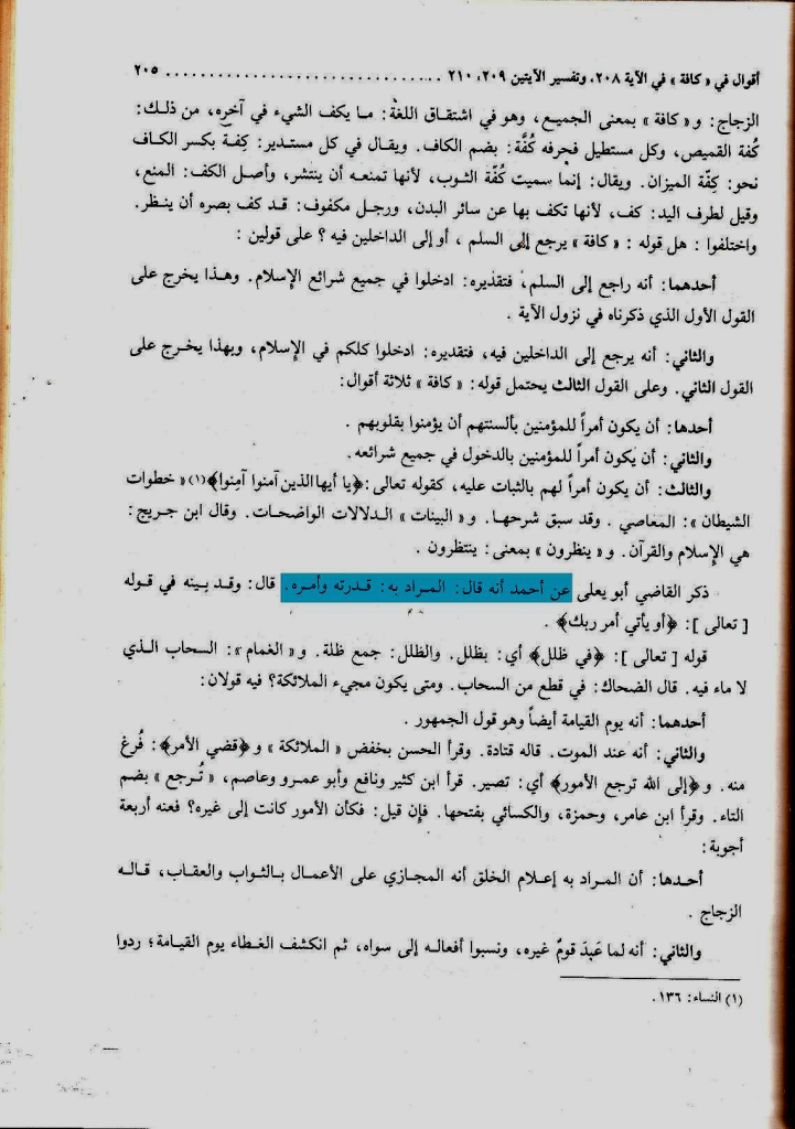 ونقل الحافظ ابن الجوزي الحنبلي في تفسيره زاد المسير عن الإمام أحمد أنه فسر قوله تعالى: « هَلْ يَنظُرُونَ إِلاَّ أَن تَأْتِيَهُمُ الْمَلائِكَةُ أَوْ يَأْتِيَ أَمْرُ رَبِّكَ » [سورة النحل]، بمجيء أمره والقرءان يفسر بعضه بعضا