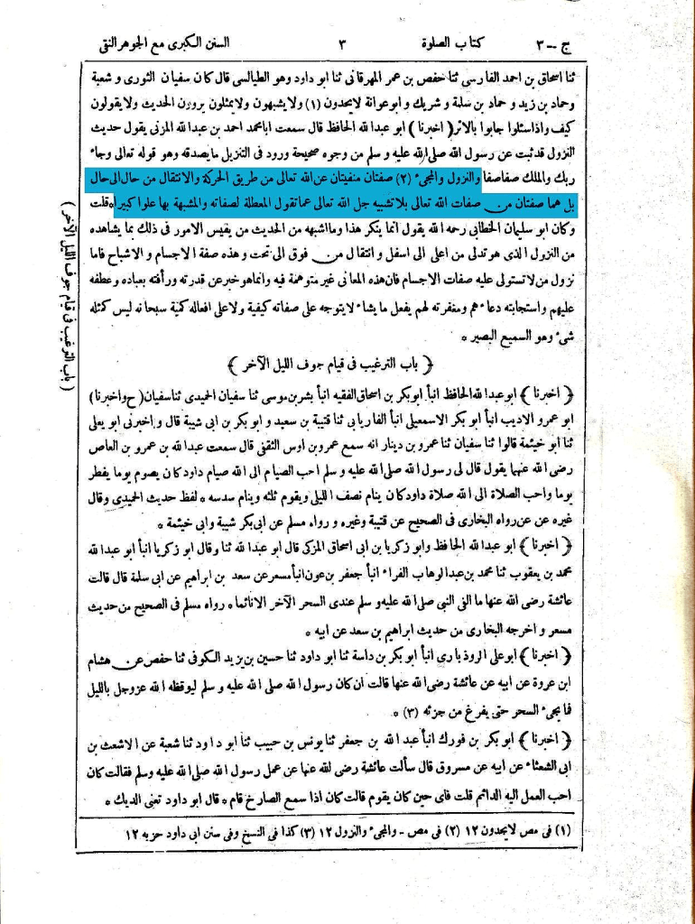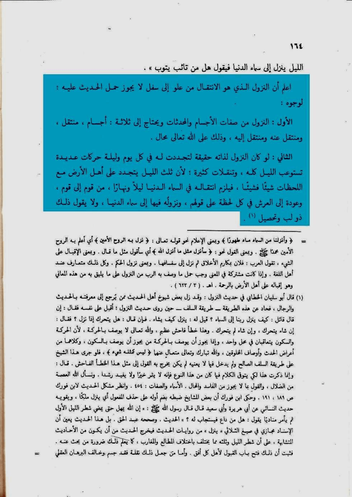 ويلزم من التمسك بظاهر رواية البخاري ومالك وغيرهما لحديث النزول المشهور أن يكون الله فيما بين النصف الثاني من الليل والفجر مستمرا في النزول والصعود إن حملوا النزول بالنسبة لكل أرض، وذلك أن الليل يختلف باختلاف البلاد فنصف الليل في بلد هو أول النهار في بلد ءاخر وقد يكون في أرض أول الليل أو أقل أو اكثر، وإن حملوا النزول على أرض واحدة فيما بين انتصاف ليلها وفجرها فبأي حجة خصصوا النزول بأرض واحدة، والحديث ليس فيه بأرض كذا