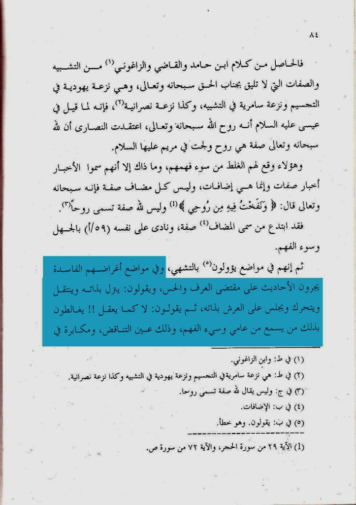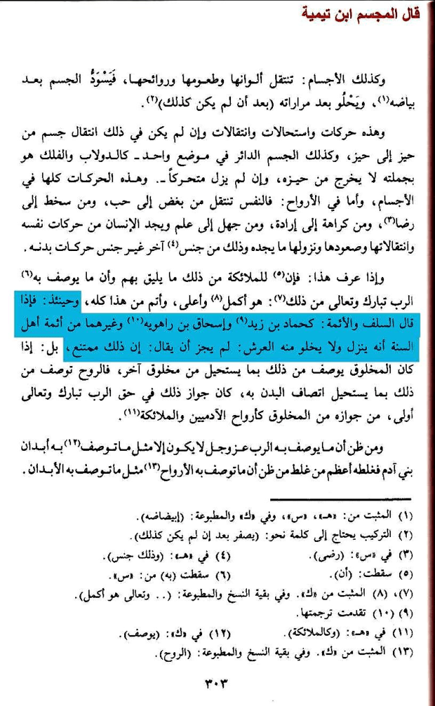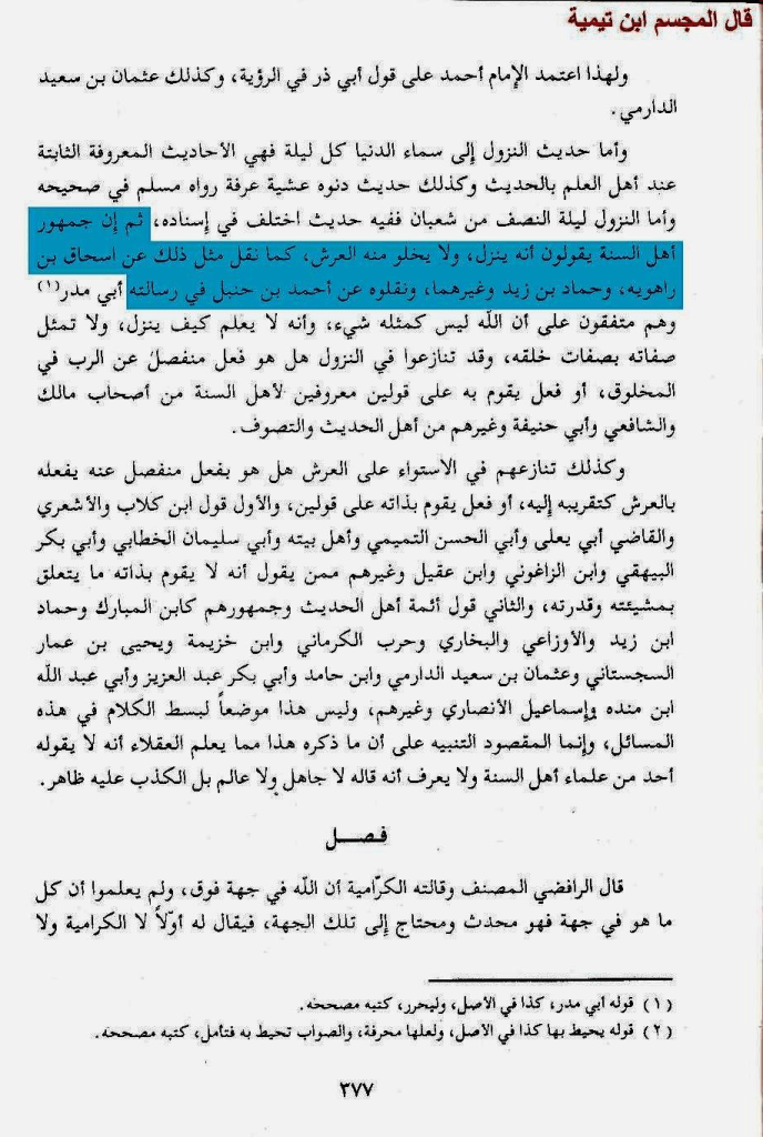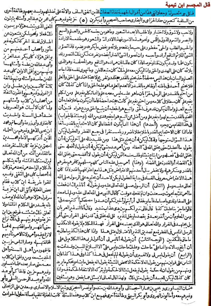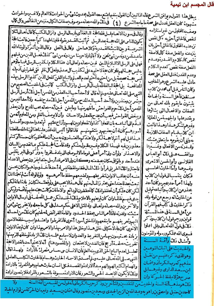 وقال فيه أيضًا ما نصه: » وأئمة السنة والحديث على إثبات النوعين وهو الذي ذكره عنهم من نقل مذهبهم كحرب الكرماني وعثمان بن سعيد الدارمي و غيرهما, بل صرح هؤلاء بلفظ الحركة وأن ذلك هو مذهب أئمة السنة والحديث من التقدمين والمتأخرين, وذكر حرب الكرماني أنه قول من لقيه من أئمة السنة كأحمد بن حنبل وإسحاق بن راهويه وعبد الله ابن الزبير الحميدي وسعيد بن منصور, وقال عثمان بن سعيد وغيره: إن الحركة من لوازم الحياة فكل حي متحرك, وجعلوا نفي هذا من أقوال الجهمية نفاة الصفات » اهـ