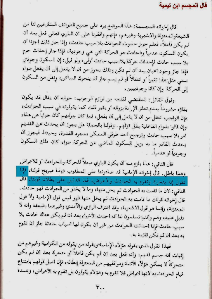«فإنا نقول إنه يتحرك وتقوم به الحوادث والأعراض فما الدليل على بطلان قولنا؟» ا.هـ