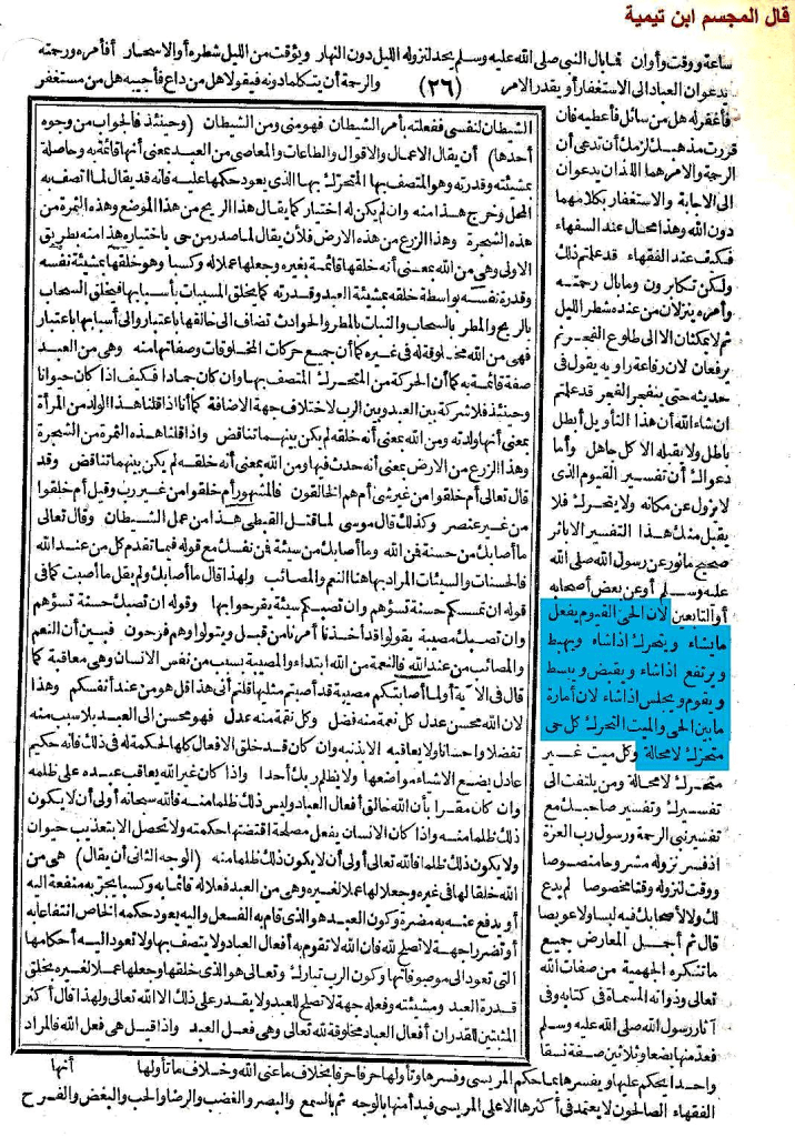 وقال في الموافقة ناقلاً كلام الدارمي المجسم ما نصه: «لأن الحي القيوم يفعل ما يشاء ويتحرك إذا شاء ويهبط ويرتفع إذا شاء ويقبض ويبسط ويقوم ويجلس إذا شاء، لأن أمارة ما بين الحي والميت التحرك، كل حي متحرك لا محالة، وكل ميت غير متحرك لا محالة» ا.هـ