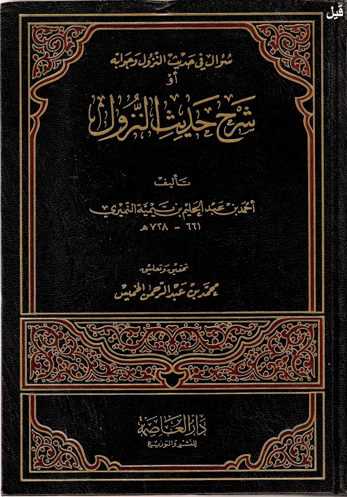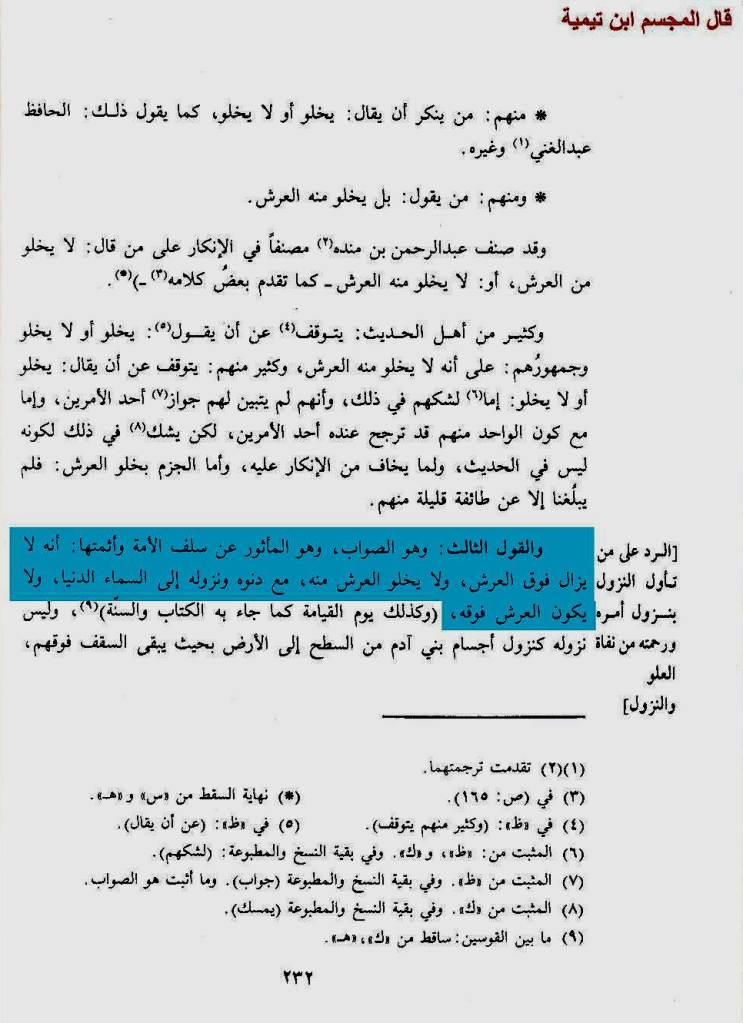 وقال في كتابه شرح حديث النزول وكتابه الفتاوى ما نصه: «والقول الثالث وهو الصواب وهو المأثور عن سلف الأمة وأئمتها: أنه لا يزال فوق العرش ولا يخلو العرش منه مع دنوه ونزوله إلى السماء الدنيا، ولا يكون العرش فوقه» ا.هـ