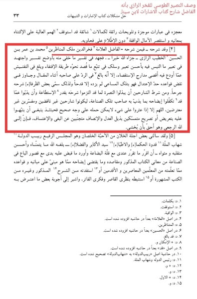 فاستدرك عليه نصير الدين الطوسي وألف كتاب شرح الاشارات، وكان الطوسي خلال استدراكاته يلقب الفخر الرازي بالشارح الفاضل
