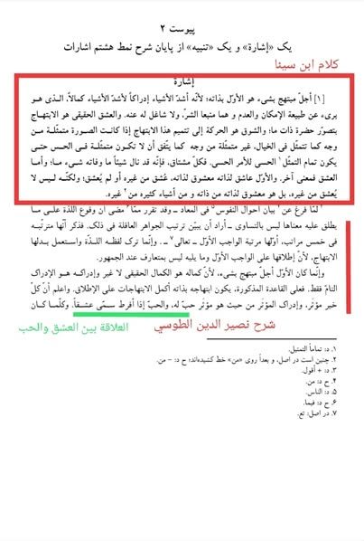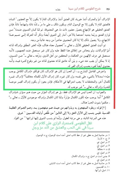 وقد شرح الطوسي كلام ابن سينا في ما نسبه لله من عشق وبيّن علاقة العشق والحب عنده، وأورد اعتراض الرازي على ابن سينا، لكنه تعقبه انتصارا لابن سينا.