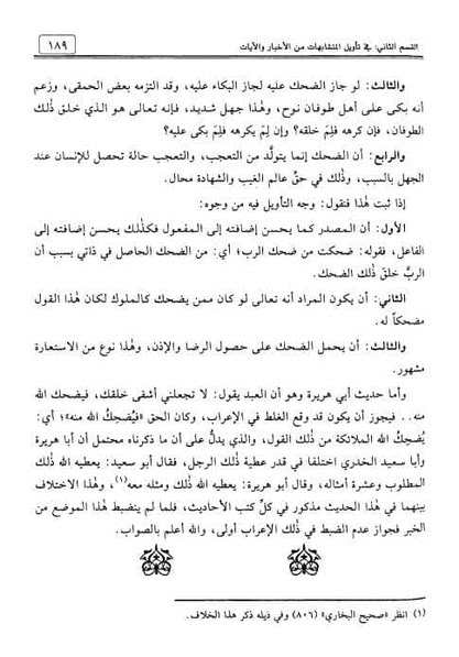 قال الفخر الرازي في تأسيس التقديس – الذي ألفه ردا على ابن حزيمة- عند مناقشة حديث الضحك المنسوب لله عز وجل : ” وأما حديث ابي هريرة رضي الله عنه وهو “ان العبد يقول لا تجعلني أشقى خلقك فيضحك الله منه”، فيجوز ان يكون قد وقع الغلط في الإعراب، وكان الحق فيضحك الله منه اي يضحك الله الملائكة من ذلك القول والذي يدل على ان ما ذكرناه محتمل ان أبا هريرة وأبا سعيد الخدري رضي الله عنهما اختلفا في قدر عطية ذلك الرجل فقال ابو سعيد يعطيه الله ذلك المطلوب وعشرة أمثاله وقال ابو هريرة يعطيه الله ذلك ومثله معه، وهذا الاختلاف بينهما في الحديث مذكور في كل كتب الأحاديث، فلما لم يضبط هذا الموضع من الخبر فجوز عدم الضبط في ذلك الإعراب وبالله التوفيق “. انتهى