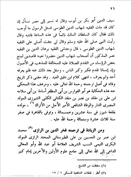 – جاء في ذيل طبقات الفقهاء الشافعيين للعبادي ما نصه: “ومن الزيادة في ترجمته فخر الدين بن الرازي محمد بن عمر بن الحسين بن على الطبرستاني المحتد الرازي المولد البكري التيمي النسب الشريف، العلامة أبو عبد الله وأبو المعالي الداعي إلى الله تعالى إلى جامع علوم الأولين والآخرين، إمام كبير، وهمام نحرير بحر لا ساحل له، فاضل عالم متقن مفتي مجتهد مناظر متكلم فقيه عظيم الشأن مشهور بكل مكان، وهو الذي أصبح رفيع الجناب عال نابه للعلماء والأفاضل مؤلاً ولذوي النهى والألباب منزلا ، أتت الدنيا إلى بابه تطلبه وله ، إمارات أشرقت الأرض شرقا وغربا بأنوار فضله فهم يستضيؤن بانواره ويتسابقون على إثاره ويعترفون من بحار علومه ويهتدون حين ينتهون بنجومه ويسمر بجميل ذكره كل سامر وحاد ، ويشهد له بالفضل فضلا على الأصدقاء كل معاد يقر له بالفضل من لا يرده ويقضى له بالسعد من لأجل العلم أمسى يتباهى بمكانه ويزداد علوا في شأنه كما قيل :