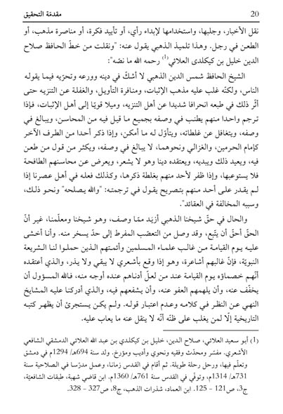 وأما قول العلائي رحمه الله: دينه وورعه وتحريه فيما يقوله، فقد كنت أعتقد ذلك وأقول عند هذه الأشياء إنه ربما اعتقدها دينا ومنها أمور أقطع بأنه يعرف بأنها كذب وأقطع بأنه لا يختلقها وأقطع بأنه يحب وضعها في كتبه لتنتشر وأقطع بأنه يحب أن يعتقد سامعها صحتها بغضا للمتحدث فيه، وتنفيرا للناس عنه مع قلة معرفته بمدلولات الألفاظ ومع اعتقاده أن هذا مما يوجب نصر العقيدة التى يعتقدها هو حقا ومع عدم ممارسته لعلوم الشريعة غير أني لما أكثرت بعد موته النظر فى كلامه عند الاحتياج إلى النظر فيه توقفت فى تحريه فيما يقوله ولا أزيد على هذا غير الإحالة على كلامه فلينظر كلامه من شاء ثم يبصر هل الرجل متحر عند غضبه أو غير متحر وأعنى بغضبه وقت ترجمته لواحد من علماء المذاهب الثلاثة المشهورين من الحنفية والمالكية والشافعية. فإنى أعتقد أن الرجل كان إذا مد القلم لترجمة أحدهم غضب غضبا مفرطا ثم قرطم الكلام ومزقه وفعل من التعصب مالا يخفى على ذى بصيرة ثم هو مع ذلك غير خبير بمدلولات الألفاظ كما ينبغى فربما ذكر لفظة من الذم لو عقل معناها لما نطق بها”. انتهى