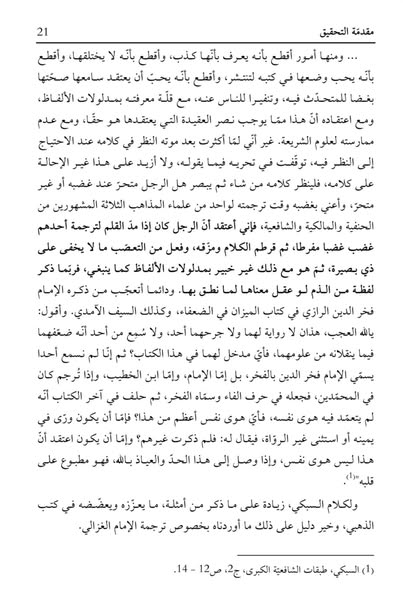 قال السبكي في طبقات الشافعية الكبرى: “أتعجب من ذكره الإمام فخر الدين الرازي في كتاب الميزان في الضعفاء، وكذلك السيف الآمدي، وأقول: يالله العجب، هذان لا رواية لهما، ولا جرحهما أحد، ولا سمع من أحد أنه ضعفهما… ثم إنا لم نسمع أحداً يسمى الإمام فخر الدين بالفخر، بل إما الإمام، وإما ابن الخطيب… ثم حلف في آخر الكتاب أنه لم يتعمد فيه هوى نفسه، فأي هوى نفس أعظم من هذا؟ فإما أن يكون ورى فى يمينه أو استثنى غير الرواة فيقال له فلم ذكرت غيرهم وإما أن يكون اعتقد أن هذا ليس هوى نفس وإذا وصل إلى هذا الحد والعياذ بالله فهو مطبوع على قلبه”. انتهـى