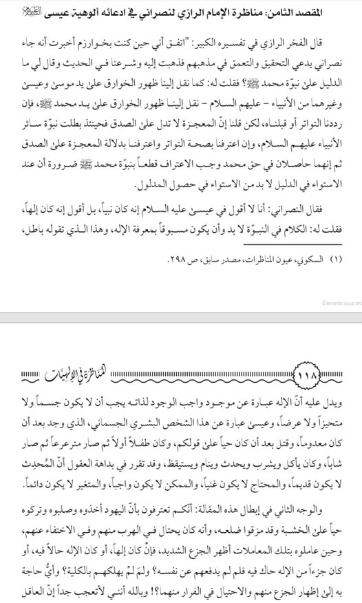 قال الرازي في تفسيره الكبير: “اتفق أني حين كنت بخوارزم، أخبرت أنه جاء نصراني يدعي التحقيق والتعمق في مذهبهم، فذهبت إليه وشرعنا في الحديث وقال لي: ما الدليل على نبوّة محمد صلى الله عليه وسلم، فقلت له كما نقل إلينا ظهور الخوارق على يد موسى وعيسى وغيرهما من الأنبياء عليهم السلام، نقل إلينا ظهور الخوارق على يد محمد صلى الله عليه وسلم، فإن رددنا التواتر، أو قبلناه لكن قلنا: إن المعجزة لا تدل على الصدق، فحينئذ بطلت نبوّة سائر الأنبياء عليهم السلام، وإن اعترفنا بصحة التواتر، واعترفنا بدلالة المعجزة على الصدق، ثم إنهما حاصلان في حق محمد وجب الاعتراف قطعاً بنبوّة محمد عليه السلام ضرورة أن عند الاستواء في الدليل لا بد من الاستواء في حصول المدلول، فقال النصراني: أنا لا أقول في عيسى عليه السلام إنه كان نبياً بل أقول إنه كان إلٰهاً، فقلت له الكلام في النبوّة لا بد وأن يكون مسبوقاً بمعرفة الإلٰه وهذا الذي تقوله باطل ويدل عليه أن الإلٰه عبارة عن موجود واجب الوجود لذاته، يجب أن لا يكون جسماً ولا متحيزاً ولا عرضاً وعيسى عبارة عن هذا الشخص البشري الجسماني الذي وجد بعد أن كان معدوماً وقتل بعد أن كان حياً على قولكم وكان طفلاً أولاً، ثم صار مترعرعاً، ثم صار شاباً، وكان يأكل ويشرب ويحدث وينام ويستيقظ، وقد تقرر في بداهة العقول أن المحدث لا يكون قديماً والمحتاج لا يكون غنياً والممكن لا يكون واجباً والمتغير لا يكون دائماً.